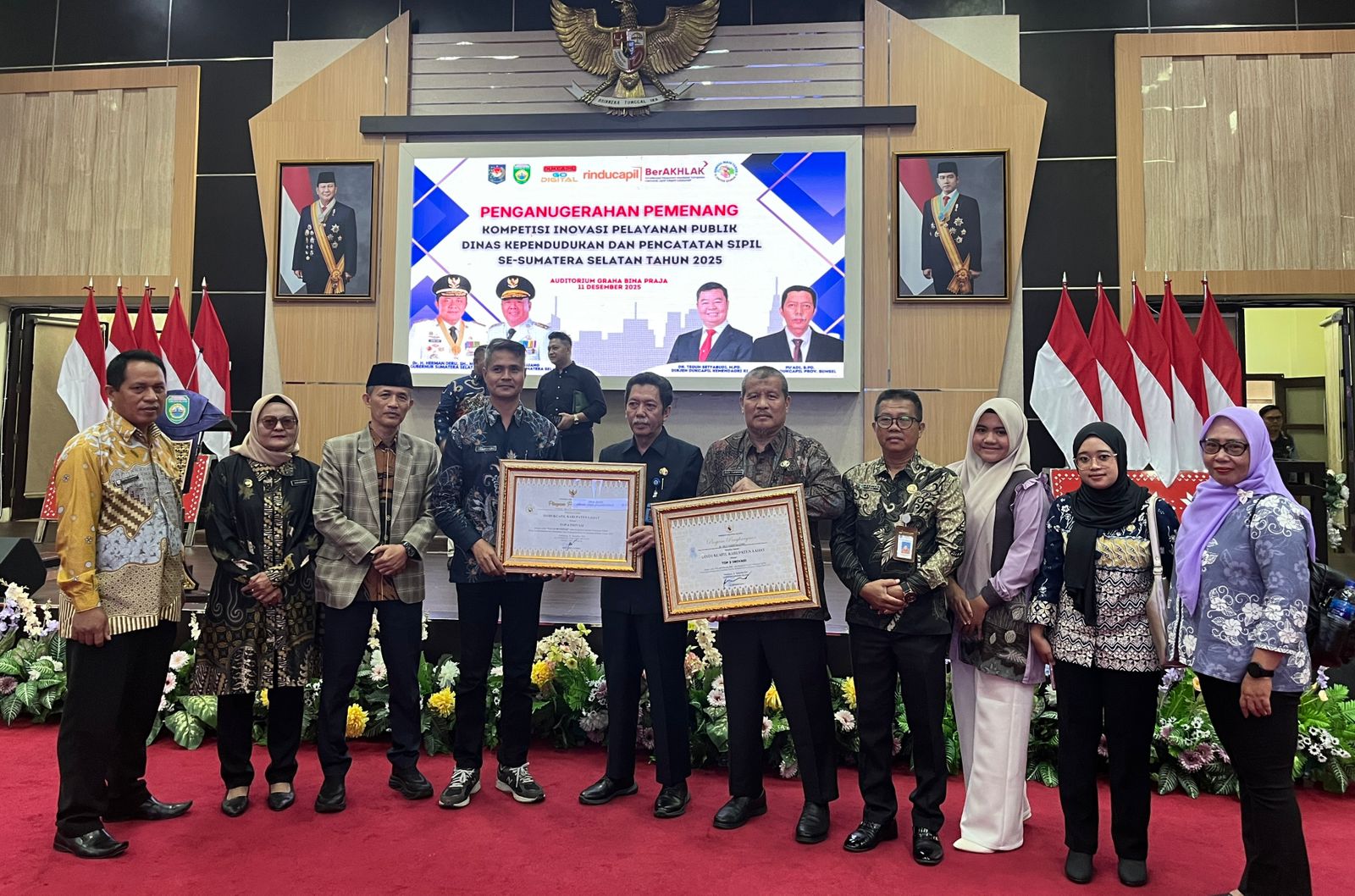 Acara penganugerahan berlangsung meriah dan dihadiri oleh para kepala Disdukcapil se-Sumatera Selatan serta pejabat pemerintah provinsi. Bupati Lahat diwakili oleh Bapak Asisten I Setda Kabupaten Lahat, yang hadir memberikan dukungan penuh terhadap kemajuan pelayanan publik di Kabupaten Lahat.Pada momentum tersebut, Dinas Kependudukan dan Pencatatan Sipil Kabupaten Lahat berhasil meraih prestasi membanggakan dengan masuk dalam Top 3 Inovasi dan Top 6 Inovasi Pelayanan Publik Disdukcapil se-Sumatera Selatan Tahun 2025 melalui inovasi andalan “Palah Beghusik”.