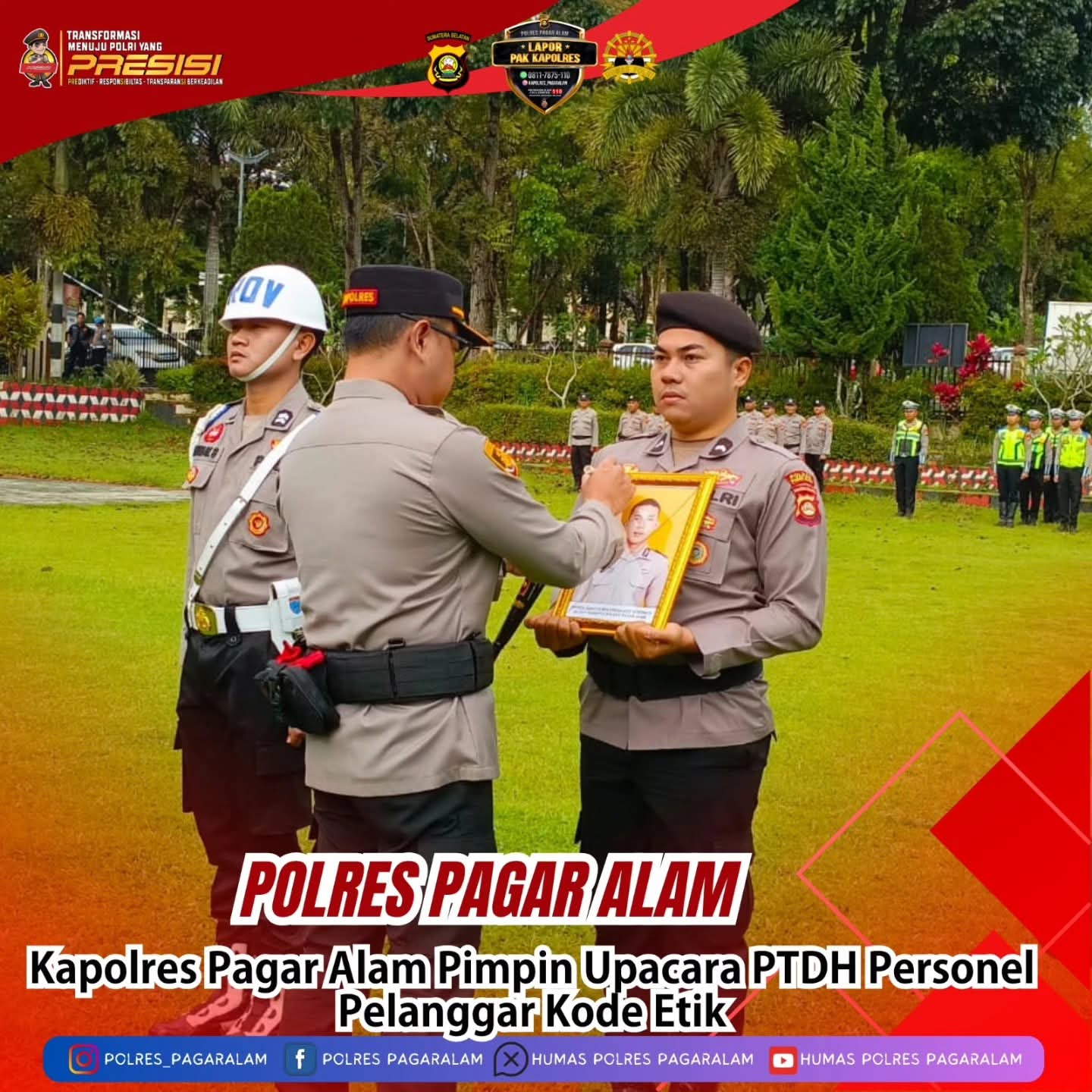Pagar Alam – Kapolres Pagar Alam AKBP Januar Kencana Setia Persada, S.I.K., memimpin langsung upacara Pemberhentian Tidak Dengan Hormat (PTDH) terhadap salah satu personel yang melanggar kode etik profesi Polri, Senin (6/4/2026) pagi di halaman Mapolres Pagar Alam.
